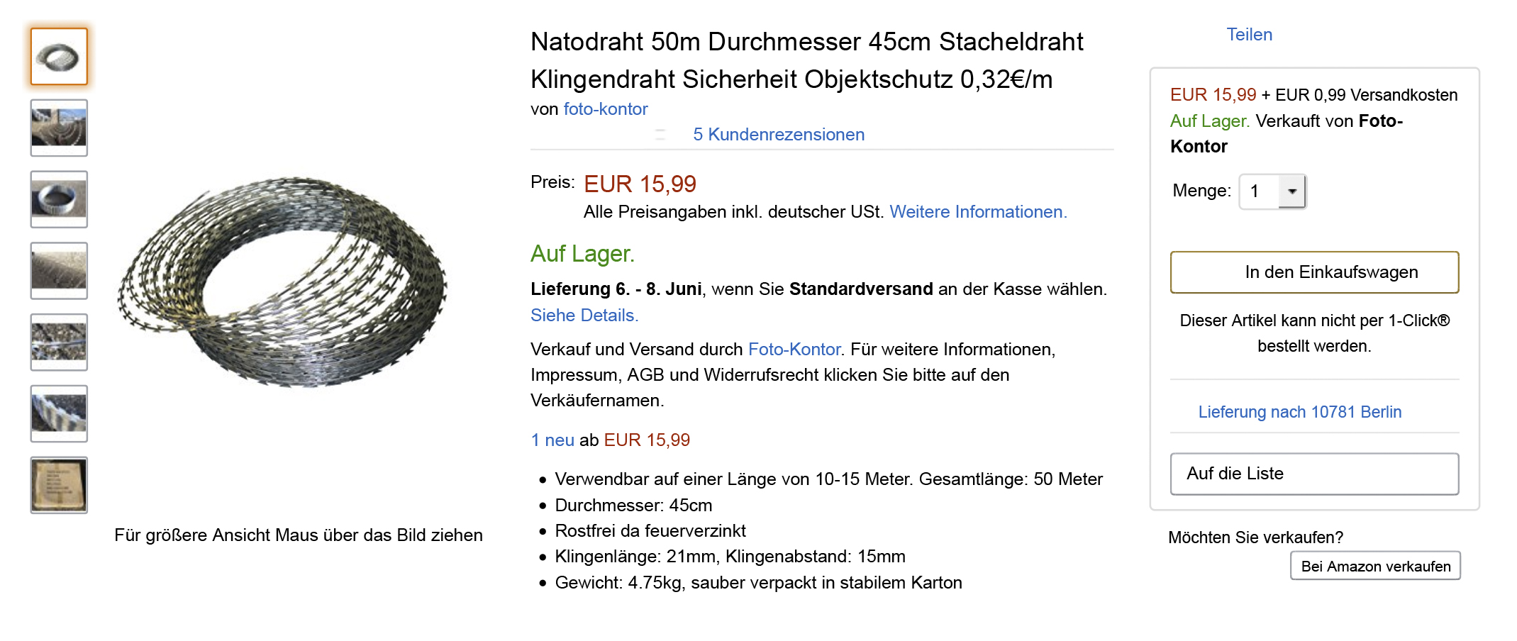 object protection 0.32 € / m. Average customer rating 5 stars.